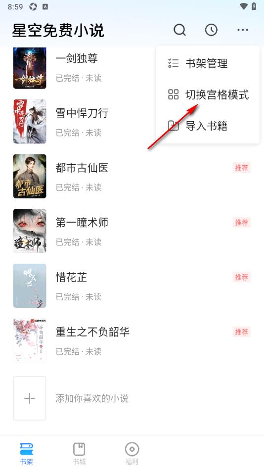一些用户在操作星空免费小说APP这款软件的时候,喜欢将一些有趣的书籍添加到书架中管理,用户可以根据需求设置一下书架的宫格模式或者是列表模式来管理书籍信息,还可以从本地导入已保存好的书籍内容,具体的教程方法用户可以来操作试试,非常简单的步骤。