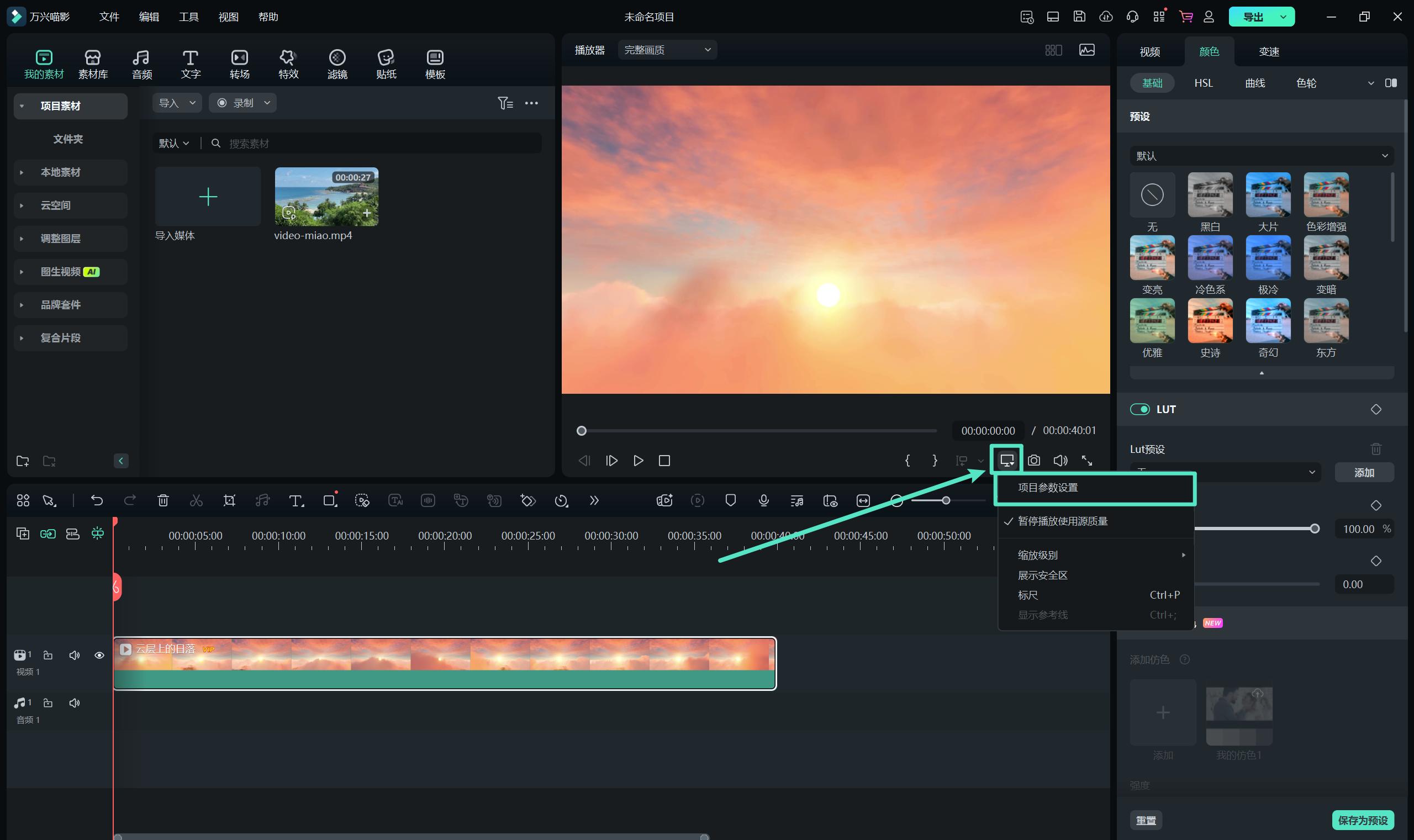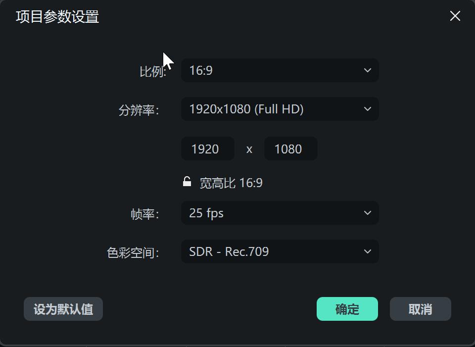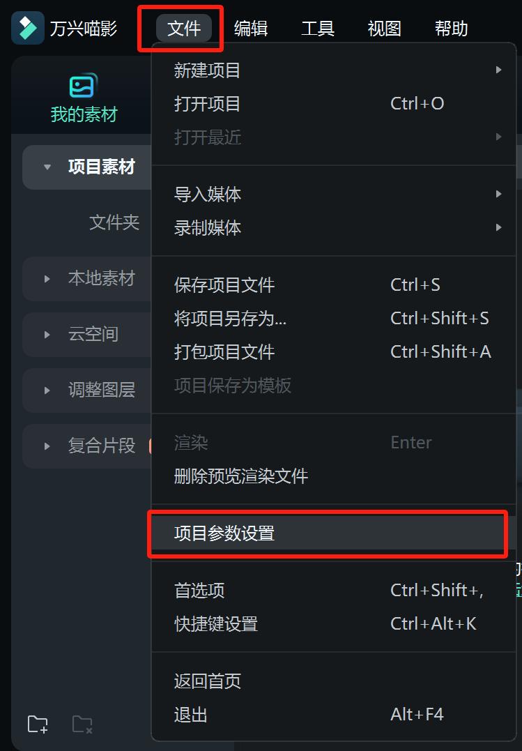或在进入到项目编辑界面中,通过选择“文件”、“项目参数设置”,可以自定义项目的比例、分辨率和帧率。