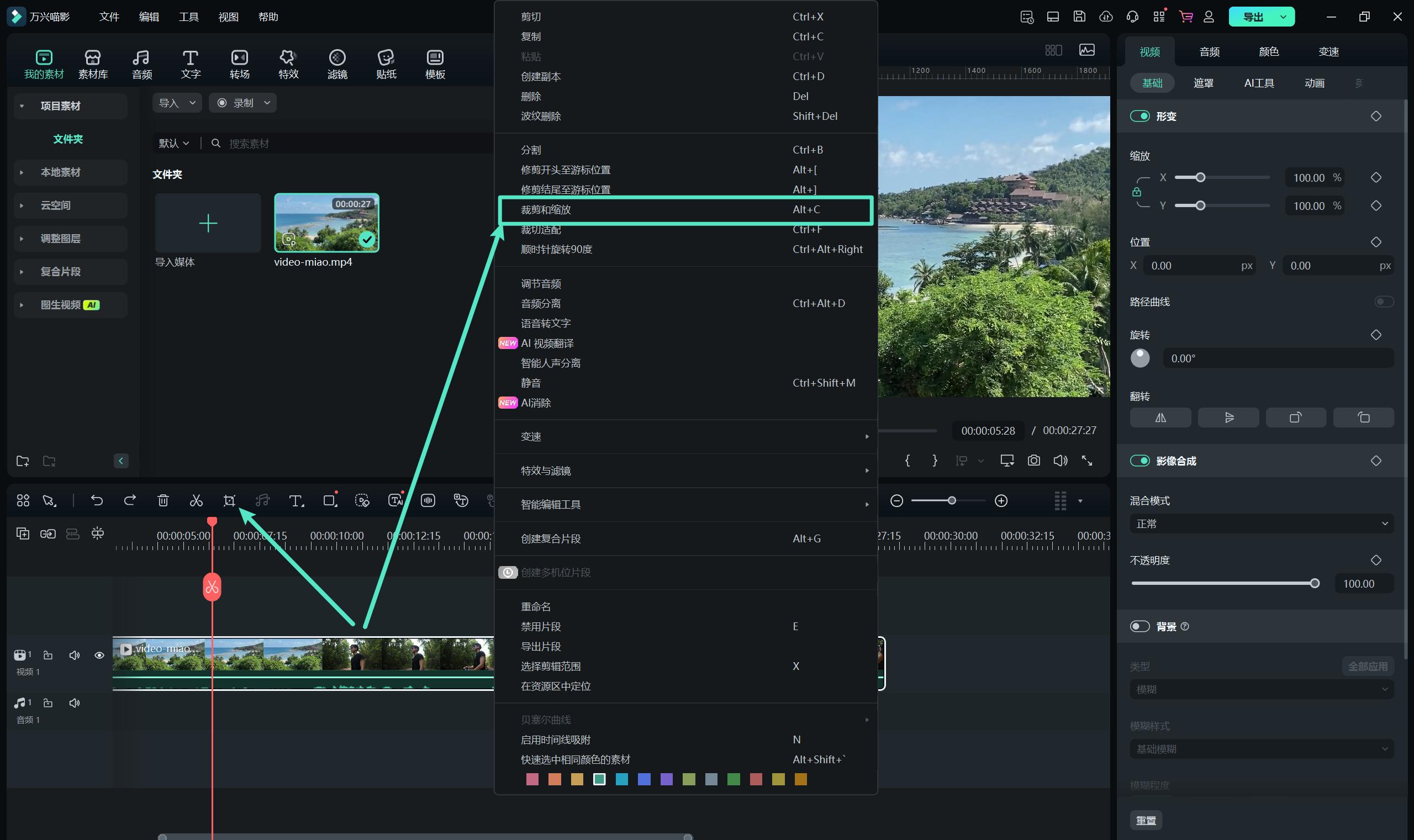 将视频导入至媒体库,并拖拽至时间轴后,右击视频片段,从右键菜单中选择【裁剪和缩放】进入面板。