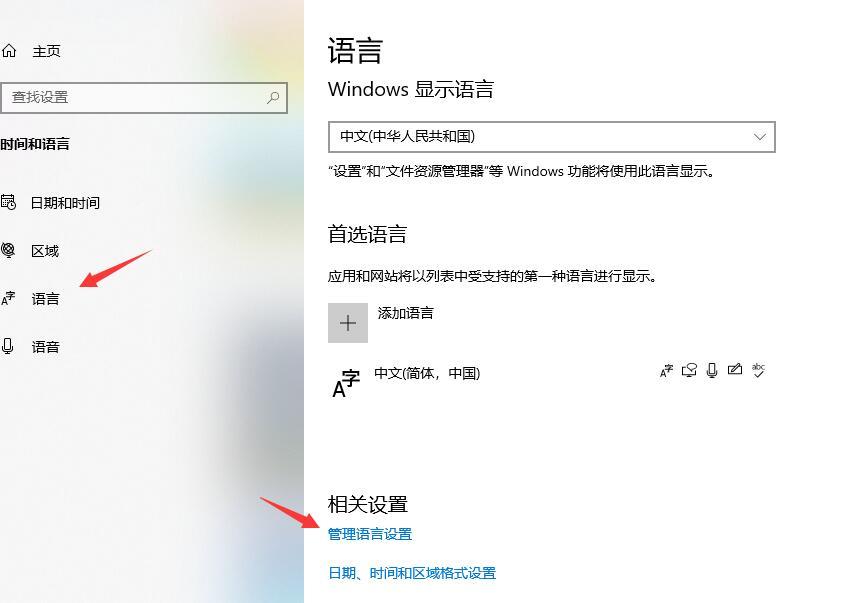 3、接着在时间和语言设置中选择语言,在右侧选择“管理语言设置”,如下图所示。