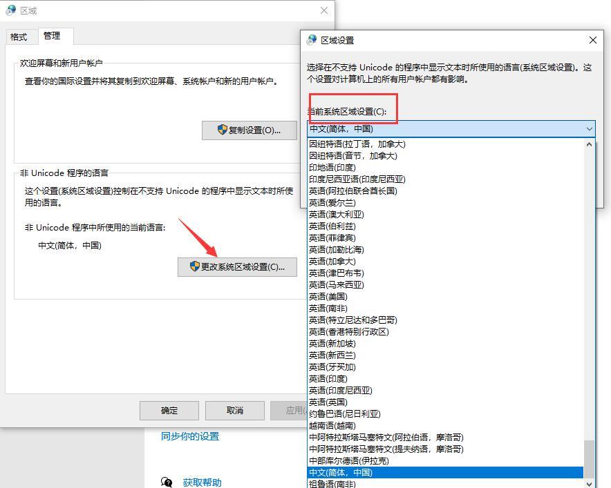 4、进入“管理”点击“更改系统区域设置”,在下拉菜单中找到你想要的区,如下图所示。