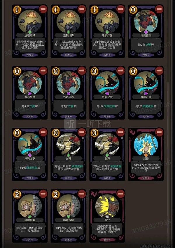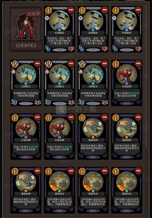 核心组件自然是套娃+白眼青龙的组合,依靠AOE伤害击杀套娃拉出自己的白眼青龙以完成OTK。由于白眼青龙只有30攻,且剑舞无法伤害深渊统御系列的随从,就导致这套卡在面对皇后卡组时显得尤为吃力,因此不建议在皇后卡组多的环境里使用。
