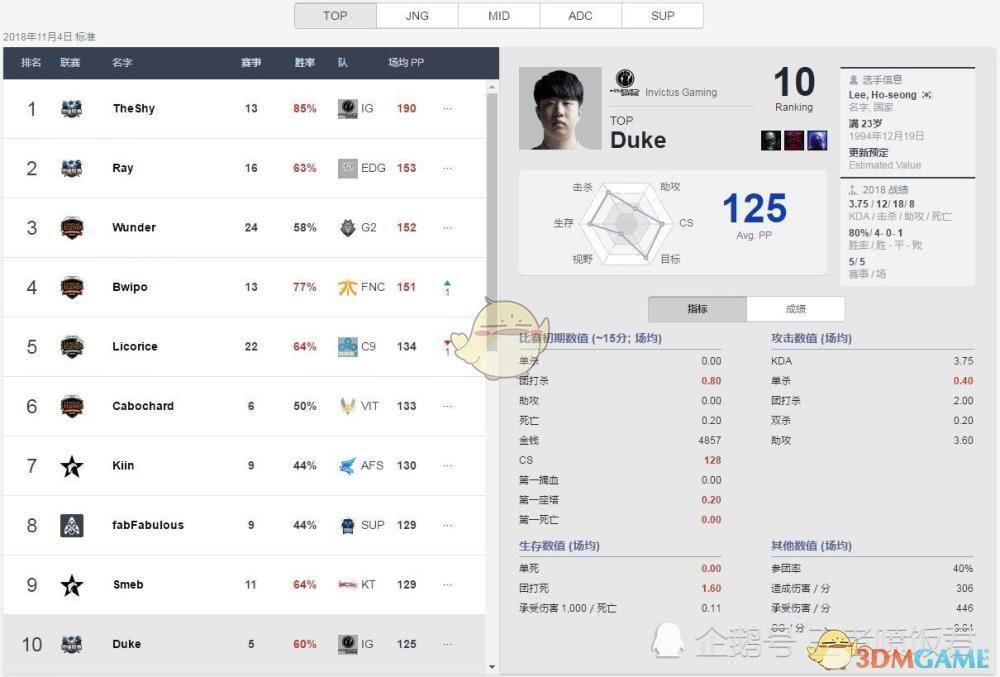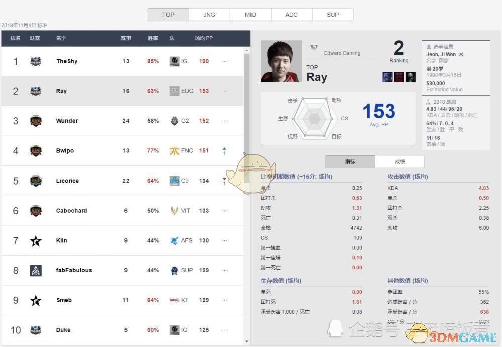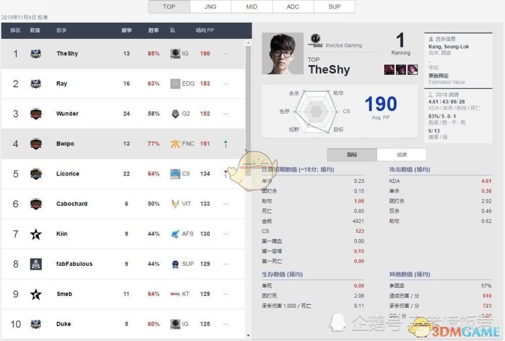 世界第一上单肯定就是冠军上单the shy了,当然这不仅仅是因为IG夺得了冠军,更重要的是the shy各项数据都非常亮眼,从右侧数据表来看,大片飘红(优异数据为红色)的数据也让the shy成了当之无愧的世界第一,最恐怖的还是the shy的胜率达到了的83%,有他在的IG只输过一场比赛!当然,IG其他选手的胜率也都很高,但the shy无疑是最高的!