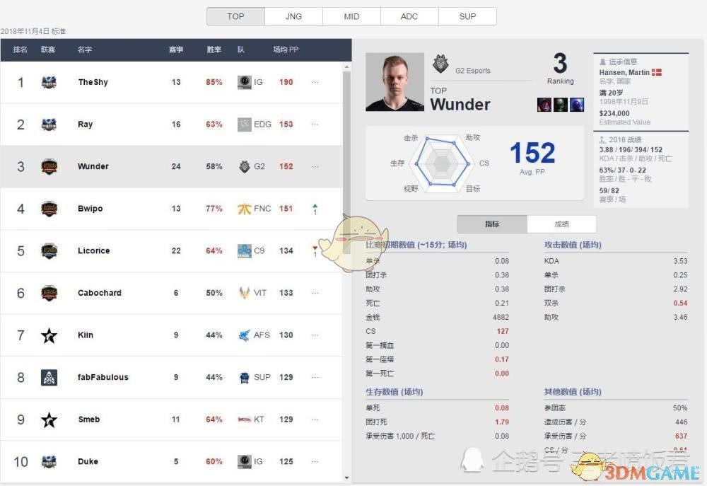 G2今年的成绩有目共睹,淘汰掉了RNG,这让G2在LPL的名声大噪,作为G2的核心Carry点之一,上单选手Wunder能在这次的排名中排到第三也就不意外了,Wunder如果不遇到the shy,饭饭君感觉他对线还是非常凶的,只不过碰到the shy后的他,被the shy的细节给征服了,以至于打到后边彻底自闭了!另外,这名选手的数据并不出众,只能算是一般,可能跟他喜欢打架有关系。