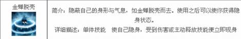 金蝉脱壳的技能是最为猥琐的技能,没有之一,原因在于天山想隐身多久,就可以隐身多久,除非在受到攻击或者主动攻击才会现身。
