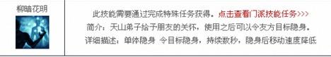 柳暗花明的技能既可以给自身使用,又可以给别人使用,同样在受到攻击或者主动攻击因为此技能也是在受到攻击或者主动攻击时会现身,满心法的天山可以给队友52秒的隐身时间,大多时间在楼兰的兵圣奇阵副本中给峨眉来个状态打BOSS的血上限。