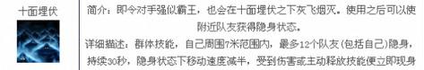十面埋伏的技能好比一件隐身衣,只不过被隐身的可以是一组人甚至是十二个人,这是一个群隐的技能,不过都得在天山周围,然而与金蝉脱壳不同的是,柳暗花明有时间的限制,只有30秒,并且隐身状态下移动速度会减慢;但是有一个好处,在群架时候,突然隐身一群人,可以让队友逃避敌对的伤害,或者藏起来,不让敌对发现出来,然后快速逃遁。