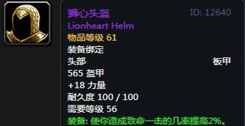 1、狮心头盔:头部,出自锻造专业,推荐附魔次级奥术融合;