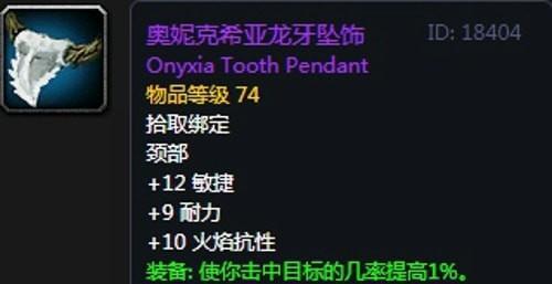2、奥妮克希亚龙牙坠饰:项链,出自黑龙公主任务线奖励;