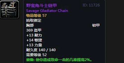 装备属性:369护甲,+13力量,+14敏捷,+13耐力,装备效果使你造成暴击的几率提高2%。