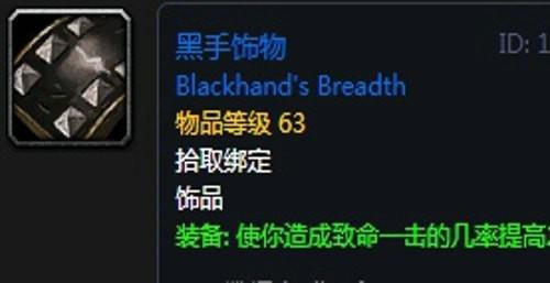 14、黑手饰物:饰品1,出自黑石塔任务掉落,联盟方可以击杀黑下最终BOSS时掉落信件接取任务,部落方则需要去荒芜之地找到军官高图斯接取任务。