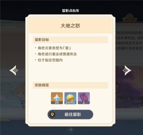 在活动页面找到本活动点击【查看详情】,点击留影点【大地之怒】的放大镜,点击【前往留影】。