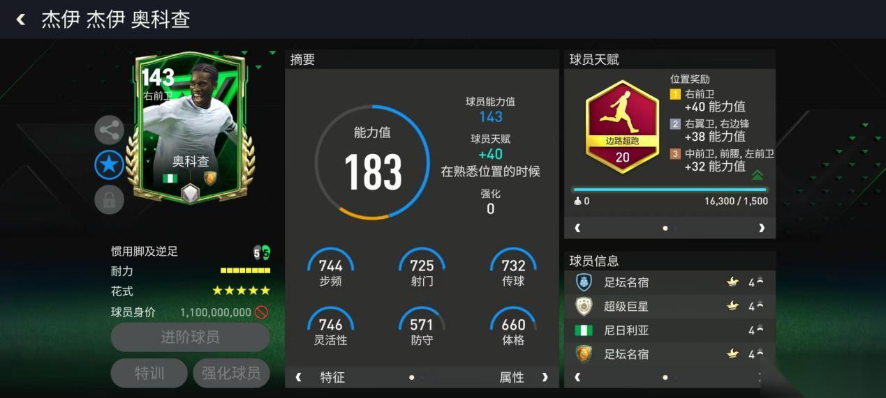 数据方面,这张创始俱乐部传奇奥科查基础能力值给到了143,这也是目前边前卫位置的最高能力值。奥科查各项的进攻数据都突破了100,灵活性与传球更是逼近了750,数据极为可观,边路超跑的天赋强化了的传球能力与突破能力,他在边路能有更多的接球与过人。五星的花式,使得他在实战中的手感大大加强。