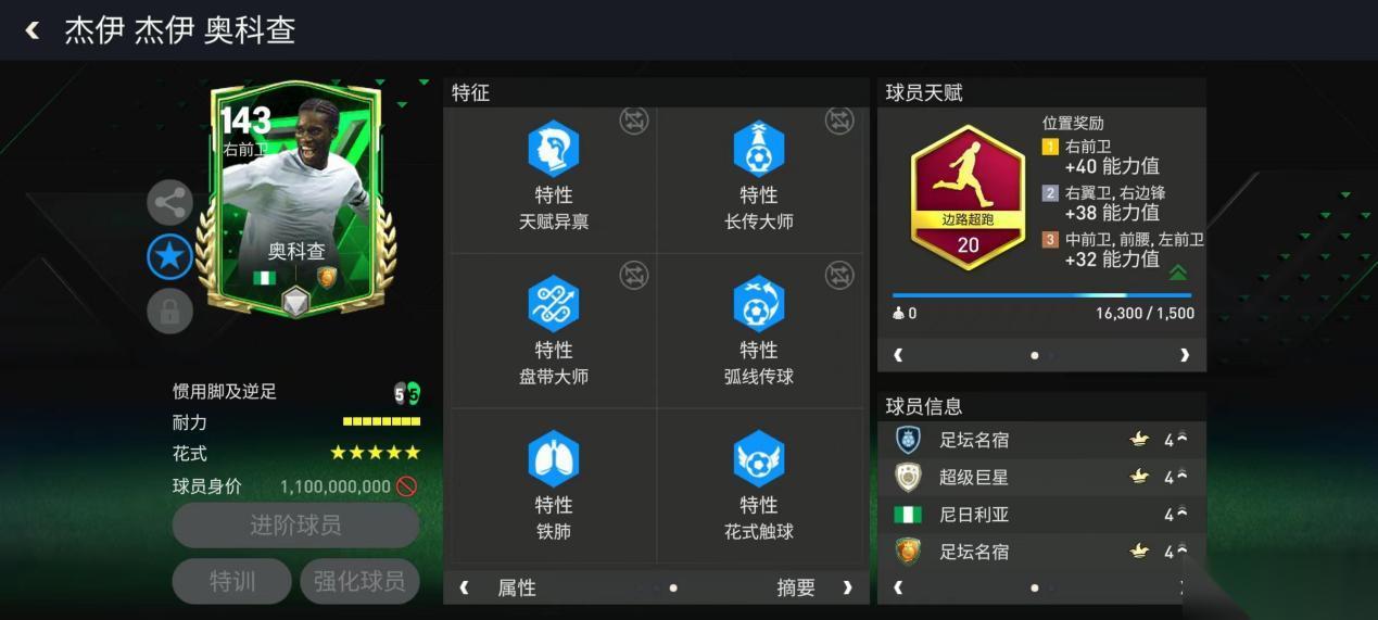 FC足球世界边路超跑天赋球员推荐——奥科查如下: