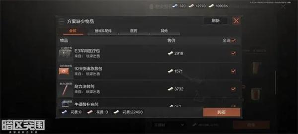 物品整备的方案,血包*1、红针*1、牛磺酸*2、止痛药*8、手术包*1、手雷*2、燃烧瓶*2、烟雾弹*2,这些物品应对局内战斗在一般情况下是足够的