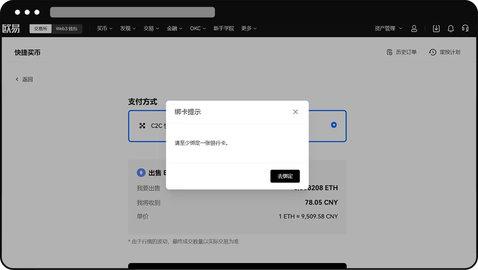 1.打开欧易官网(www.okx.com),点击【买币】-【C2C买币】-【快捷买币】-【出售】,选择收款币种和卖币币种,输入出售金额,点击【出售XXXX】。在新界面确认您的订单,并点击出售。如果您未提前绑定卖币收款方式,请依据界面提示绑定。