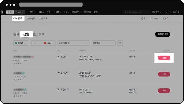 3.您还可以选择 C2C 卖币,打开欧易官网( www.okx.com ),点击【买币】-【C2C买币】-【出售】。可以根据商家的信用等级、完成率、平均放币时间、支付方式、单价等,自主选择交易商家。具体交易步骤与快捷买卖相似,按页面提示操作即可。