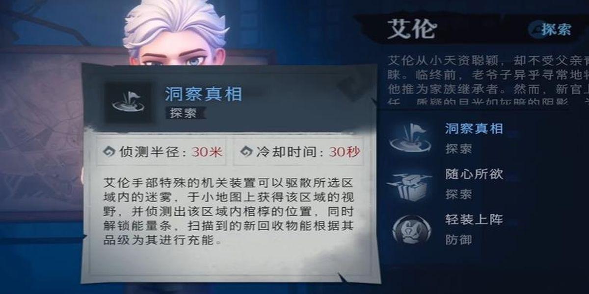 3、主动技洞察真相能依靠手部特殊机关驱散所选区域迷雾,在小地图显示视野,侦测出棺椁位置,还会解锁能量条,按扫描到的新回收物品级充能。