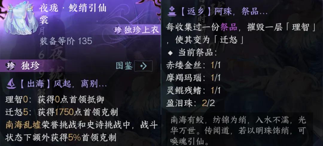 夜珑·鲛绡引仙裳:135装等独珍上衣,独珍效果为收集满5个祭品后,获得1750点首领克制,前三个祭品是浅海123的独珍装备,后两个祭品在灵须巨鲲·荣誉挑战3和夜珑·荣誉挑战1中获得。