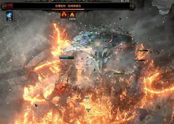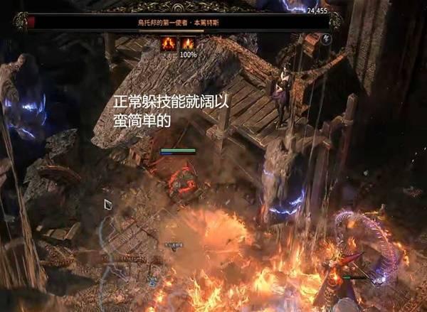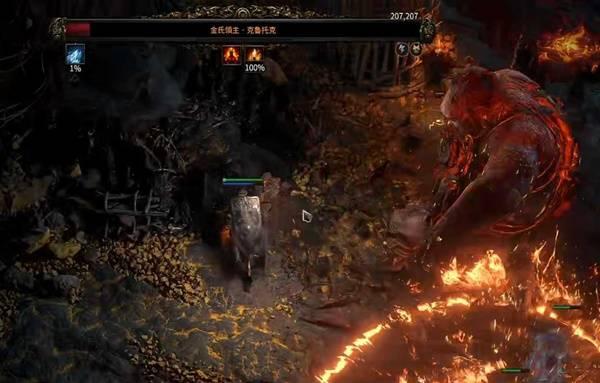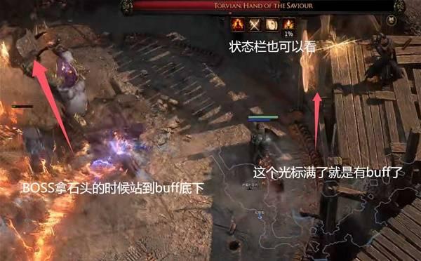 走到最后我们需要击杀托维安。这里要注意啊,这个boss他旁边会有三个塔台,上面站着三个小怪给他加buff。当小怪给他加上buff之后呢,boss会捡起石头来砸你,这时候通过走位把石头引到旁边的小怪上就可以打破这个buff了。再打完之后就可以直接进入下一张地图挖掘了