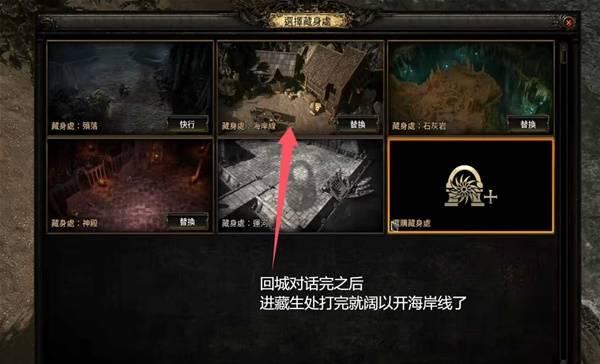虽然说这张地图显示有藏身处海岸线,但实际需要回城找NPC安洁才能开启藏身处的任务,完成后她会进入你的藏身处,这时你才能使用离线仓库买卖装备。