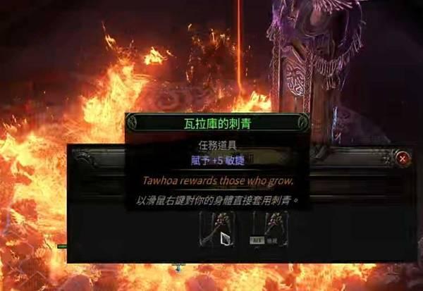 接下来往前走,进入亡者之殿,这里我们依然是需要通关三个试炼,每一个试炼都会掉落一个刺青跟雕像相互动之后可以自由选择三种属性或者三种抗性的提升,然后进入祖灵试炼接待boss后获得任务道具。在和娜瓦莉对话就可以获得2点天赋点。