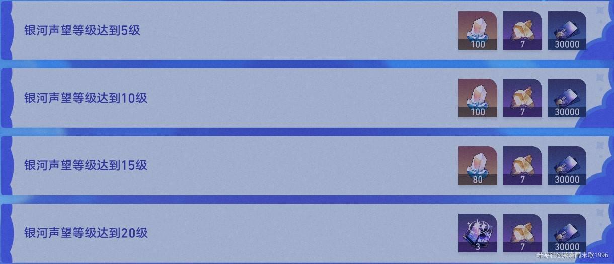 此外,本次活动另有声望等级奖励系统,在通过任意关卡后均可获取一定量银河声望以提升等级换取奖励。但无需特别在意,一次性通过所有关卡即可接近升到20级拿满所有奖励,若有意外至少再打一局即可升满等级拿到所有奖励