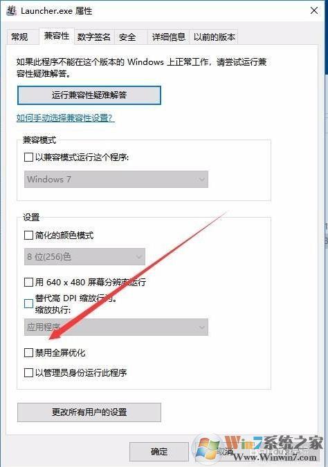 2、然后在属性—兼容性这一项下,我们可以看到下面的 禁用全屏优化,勾选后—应用,就可以了。