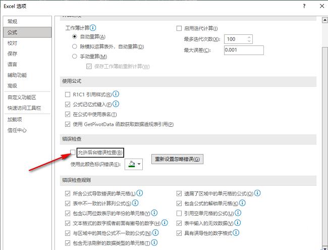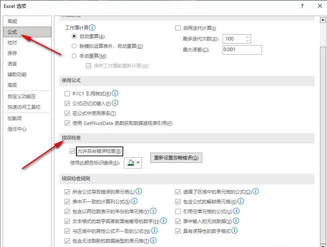 3、在打开的窗口界面中,点击左侧栏中的"公式"选项,然后找到右侧中的"错误检查"一栏。