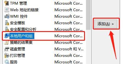 7、选择列表中的"本地用户和组",并点击右侧的"添加"按钮。