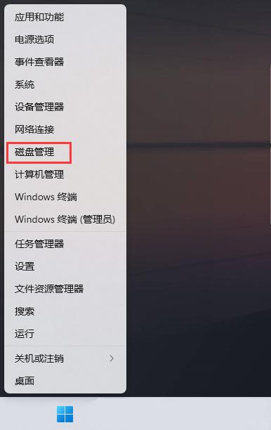 1. 首先,按键盘上的【 Win + X 】组合键,或右键点击任务栏底部的【Windows开始图标】,在打开的隐藏菜单项中,选择【磁盘管理】。