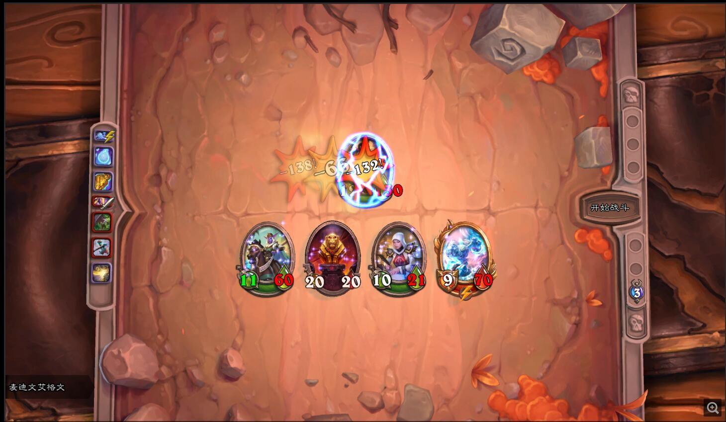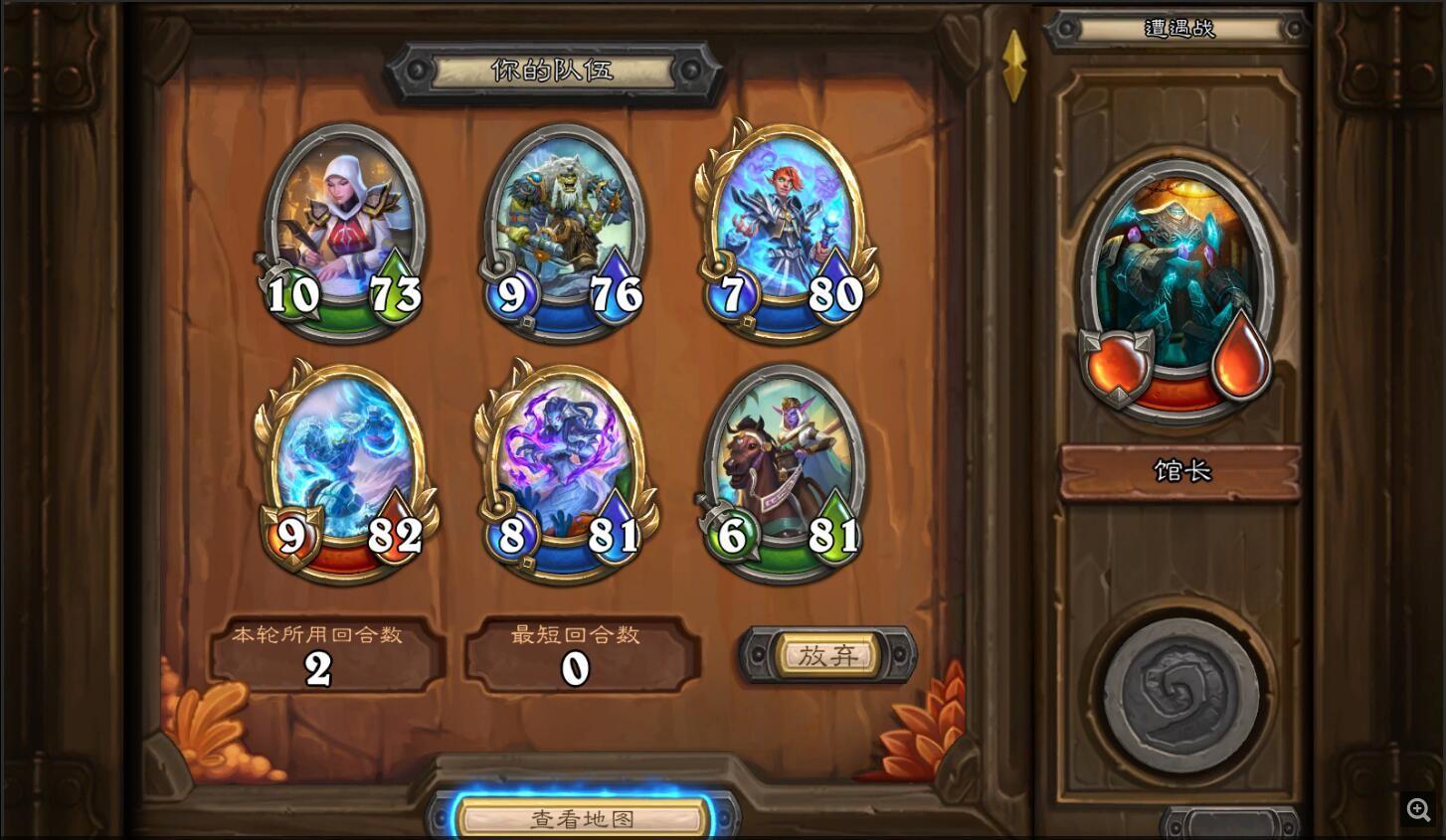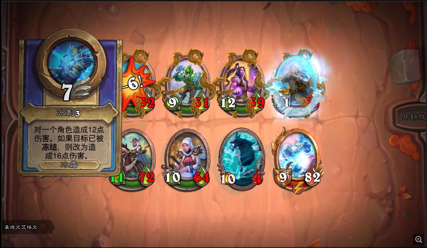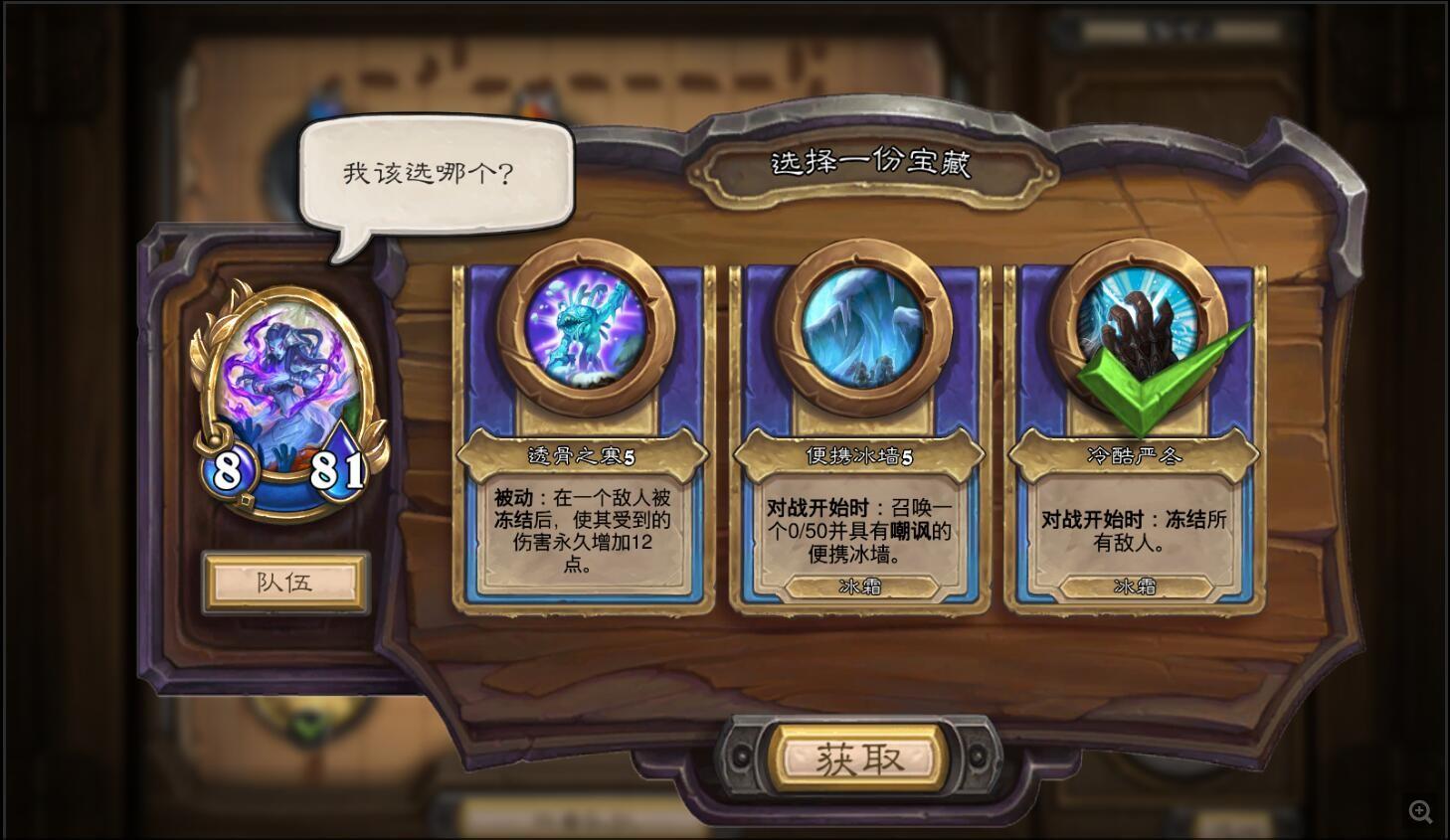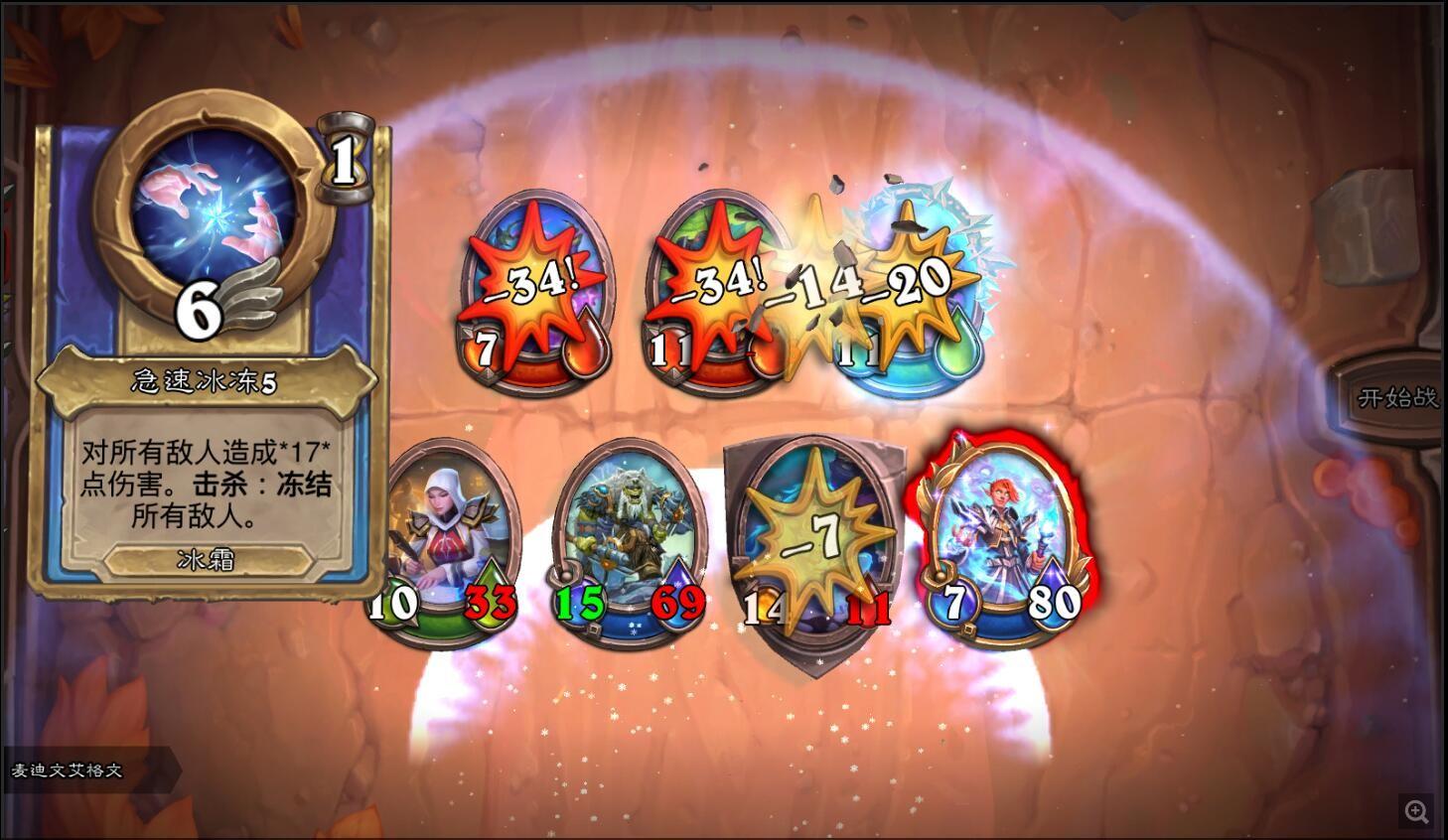 思路: 雪王和扎吉拉有开场冰,依然是选择前6关最少能踩2个精英关的图,冷酷严冬几率很高。普通难度3小怪根本没有难度,开场水元素和德雷克冻2个直接形成3v1局面,就算德雷克不想用随机冻,招个嘲讽狼也是可以的,精英关如图,伊利斯缠绕,水元素控冻住远程狼王,黄金猿核弹出来直接清场。拿了“冷酷严冬”后,顺路踩了个法系无cd赐福,晨拥无限冰枪冻结,一回合boss直接被秒,没什么难度。