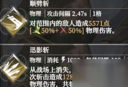 顺劈斩普通攻击在基础性伤害中就属于一个中坚力量。虽然只不过是覆盖一格射程,并且没有能量消耗,但是只要是范围内的敌人,全部都会造成物理性伤害。伤害构成中攻击力50%,敏捷50%。所以这也就意味着都以及敏捷属性,还有提升战斗力是比较重要的。