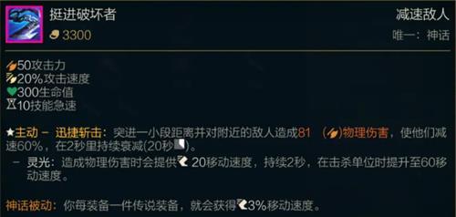 游戏LOL中,挺进破坏者神话装备的价格是3300金币。挺进破坏者神话被动:你每装备一件传说装备,就会获得3%移动速度。装备主动技能是迅捷斩击:突进一小段距离并对附近的敌人造成81物理伤害,使他们减速60%,在2秒里持续衰减(20秒冷却时间)。灵光:造成物理伤害时会提供20移动速度,持续2秒,在击杀单位时提升至60移动速度。