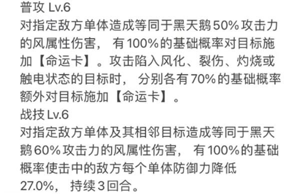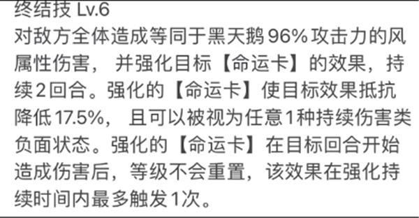 黑天鹅的角色定位是五星风系虚无,桑博的五星替代,核心机制是命运卡和减防,有很强的持续伤害和削弱能力。