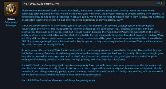 自从我们公布魔兽世界怀旧版以来, 很多玩家都在询问有关法术批次(Spell Batching)方面的问题. 尽管在游戏中我们并没有完全消除这个现象, 但也确实做出了一些改动, 包括如何以及以多快的频率处理玩家的一系列法术动作, 因此在现今的游戏中玩家很少会注意到这种情况. 一直以来我们在努力确保魔兽世界怀旧服法术和特效激活方面的游戏体验, 与当年玩家在进行游戏时保持一致.