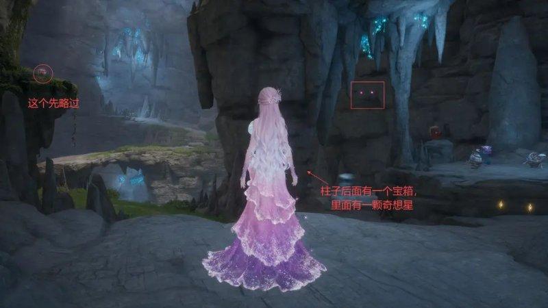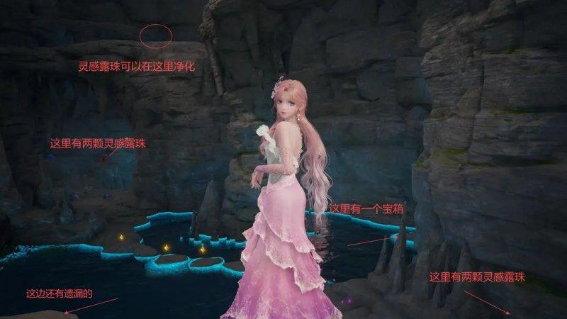 当你走到洞窟的尽头时,会看到一个宝箱静静地躺在那里,仿佛在诉说着过去的故事。而在这个位置附近,还有两颗容易被遗漏的灵感露珠,它们隐藏在角落里,需要仔细观察才能找到。