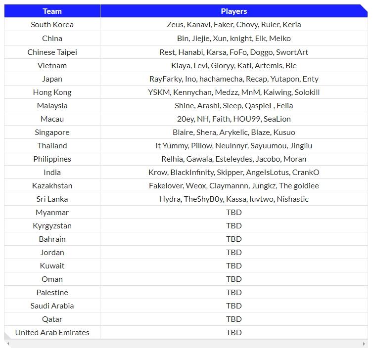 目前已确认大名单的亚运会英雄联盟参赛队伍有:中国队、中国台北队、中国香港队、中国澳门队、韩国队、越南队、日本队、马来西亚队、新加坡队、泰国队、菲律宾队、印度队、斯里兰卡队、哈萨克斯坦队。