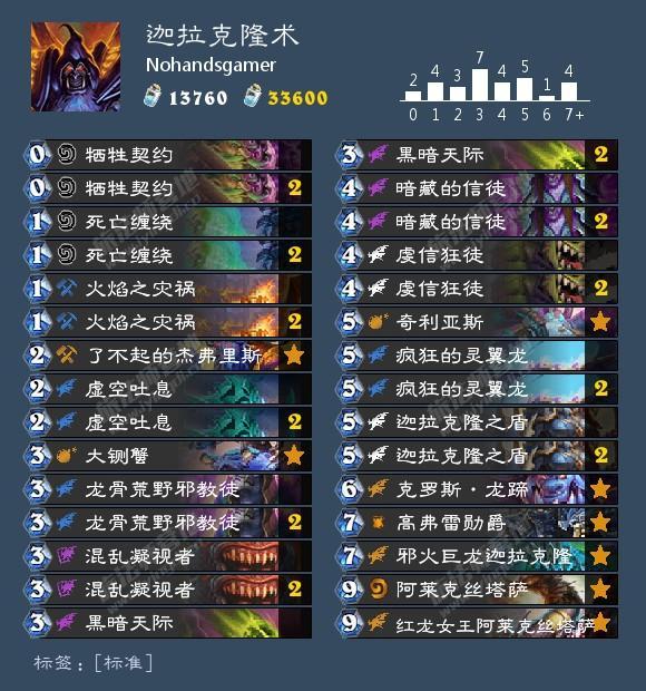 这是twitch主播Nohandsgamer打到传说23名的迦拉克隆术。Nohandsgamer是最早开始玩迦拉克隆术的主播之一,对这套卡组的理解十分深刻。这套卡组放弃了邪鬼仪式,加入了新卡混乱凝视者。邪鬼仪式在削弱后一直表现不佳,空场打出只有两个2/1身材的恶魔,收益不高,作为4费法术配合火焰之灾祸也难称方便。混乱凝视者可以在3费时直接打出,不亏身材也不会卡手,很多时候能够有效打乱对手节奏,是一张非常好用的随从。总体而言,这套卡组思路不变,前期尽量解场并完成祈求,中期返场并通过变身给予对方压力,后期既可通过红龙女王阿莱克丝塔萨一波压死对手,也可通过了不起的杰弗里斯伺机斩杀。