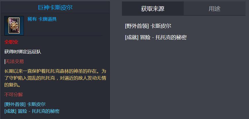 野外首领-卡斯皮尔随机掉落、成就-托托克的秘密(进入副本50次)、凌晨之叶卡包、黑暗之夜卡包、蓝色品质卡包。