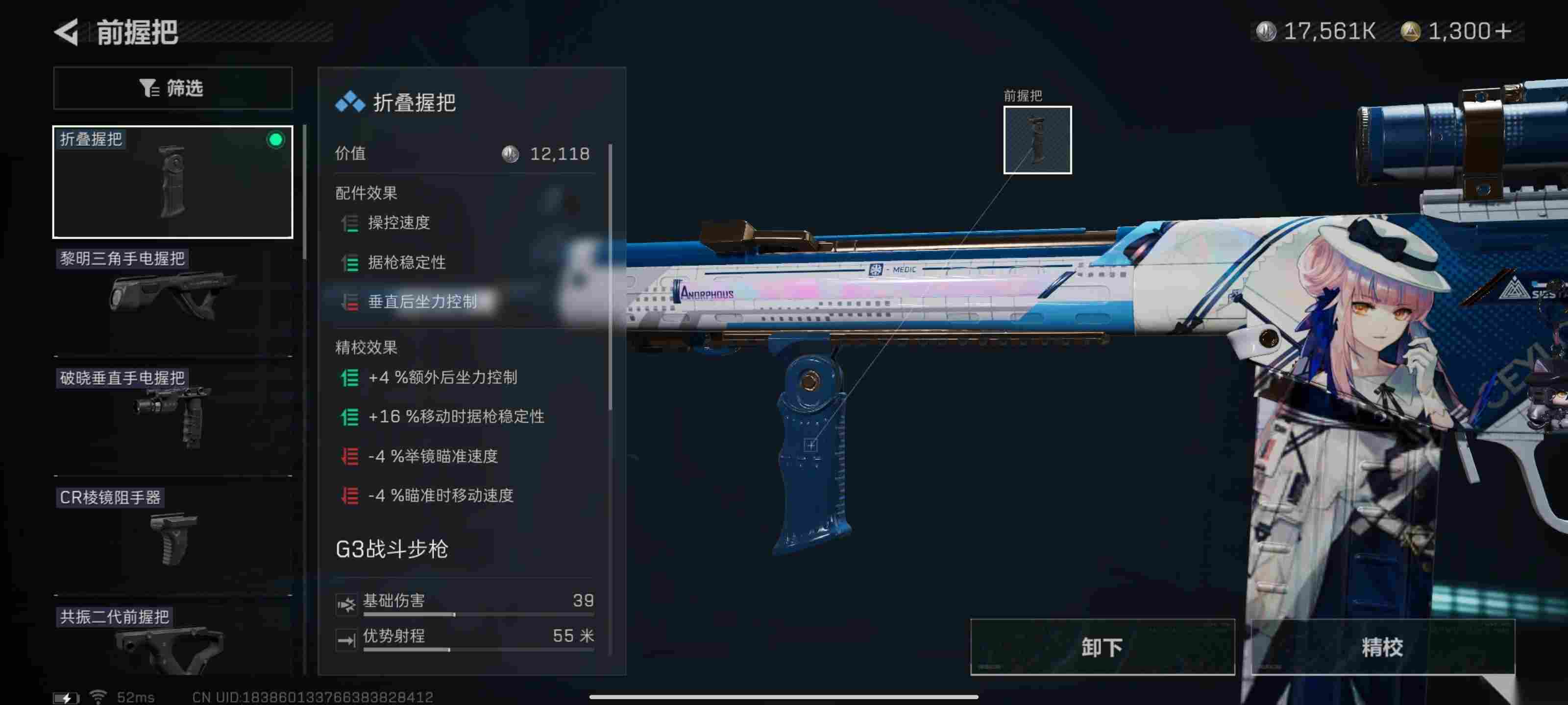 握把我选择的是折叠握把。这个握把虽然有很明显的后坐力控制这个负面属性,但是拥有一定的操控速度以及据枪稳定性,通过精校折叠握把的垂直后坐力的负面属性几乎可以忽略不计。