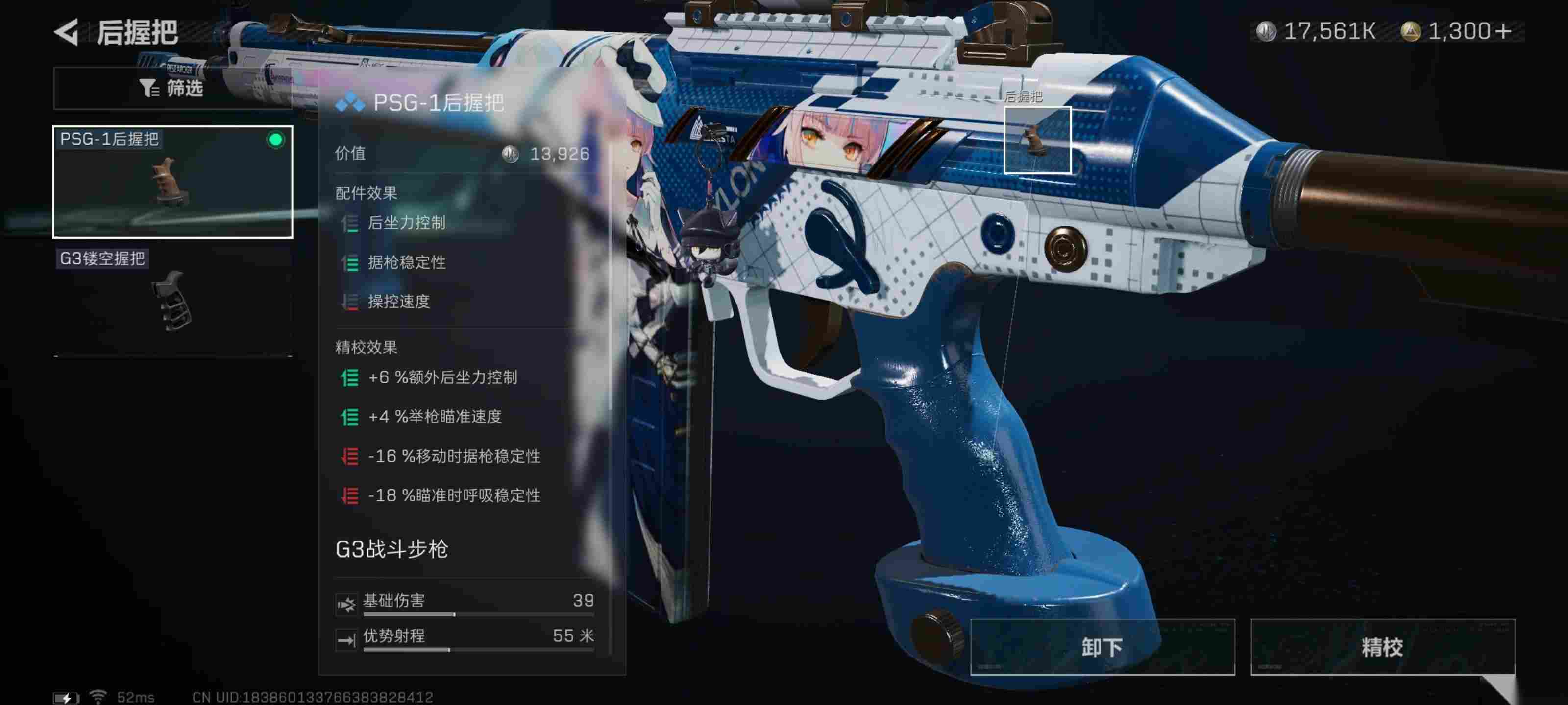 后握把我选择的是psg—1后握把。在减少极低的操控速度上,增加了非常客观的据枪稳定性还有小幅度的后坐力控制。