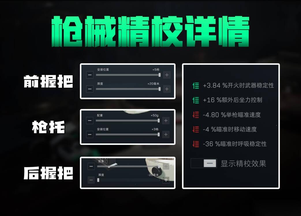 前握把精校向右拉满,枪托向右拉满,后握把配重向右拉满,厚度向左拉最低。这样精校可以小幅度的减少举镜瞄准速度,大幅度增加后坐力控制以及可观的开火时的稳定性。