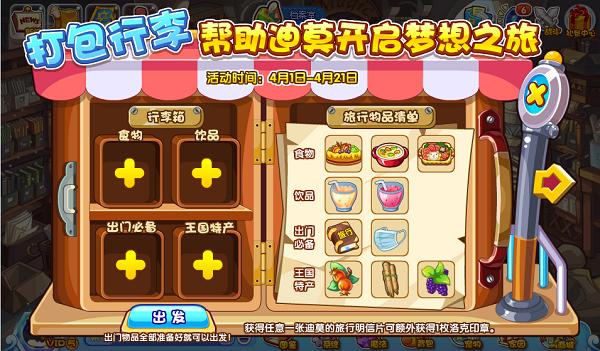 迪莫队长出去旅行,需要小洛克们准备好食物、饮品、出门必备品、王国特产。玩法类似《旅行青蛙》,所有行李准备完毕,迪莫队长就会出发,旅行10分钟,结束后会带回来丰一些小礼品!(搭配物品越贵奖励越好)