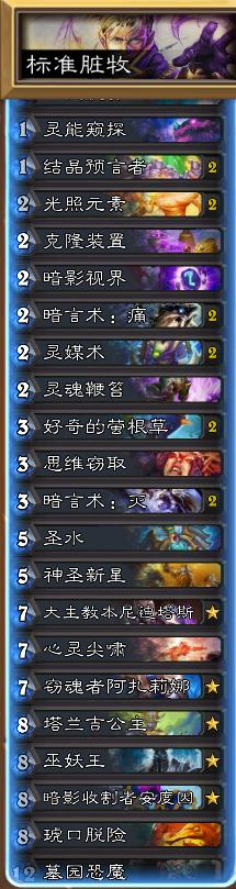 替代卡牌:如果想要完全脏的话可以带上一些脏但是亏节奏的卡,如5费脏3张或者带多几张思维窃取和精神控制。645也可以带的,某些2攻随从还是不错的。如果要增加强度或防御力,可以带奇利亚斯,石丘防御者等。