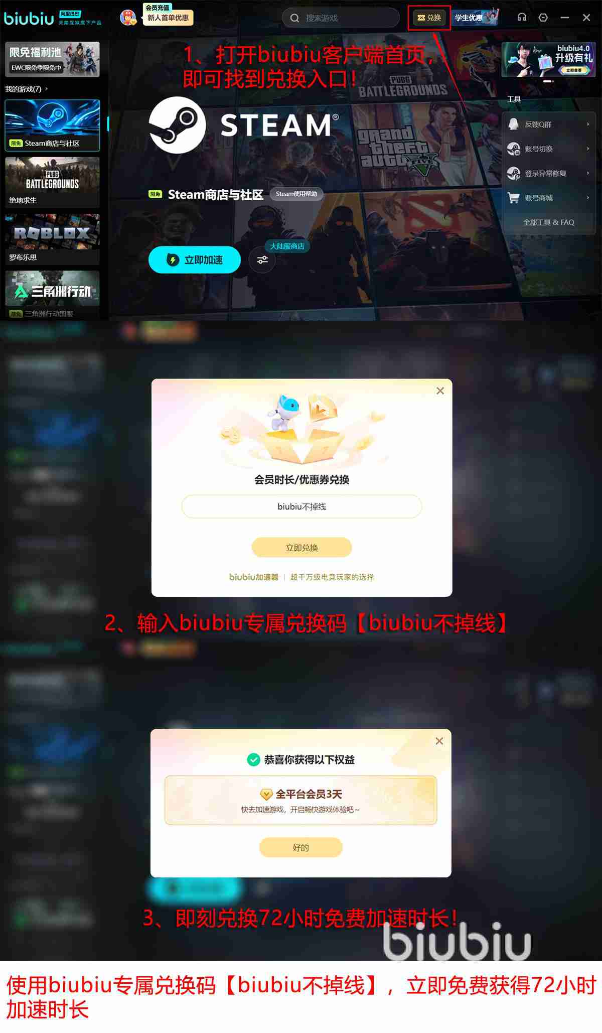目前,使用【biubiu不掉线】,即可获取3天时长。对于新玩家在完成注册登录流程后,系统将自动赠送24小时免费会员。若将这两项进行搭配使用,累计可获得长达96小时的体验。