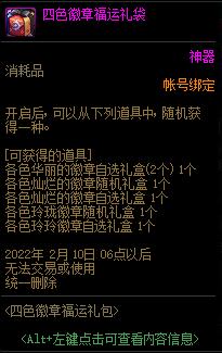DNF四色徽章福运礼袋开启后,可以从下列道具中,随机获得1中。可获得的道具:各色华丽的徽章自选礼盒(2个)1个、各色灿烂的徽章随机礼盒1个、各色灿烂的徽章自选礼盒1个、各色玲珑徽章随机礼盒1个、各色玲珑徽章自选礼盒1个。